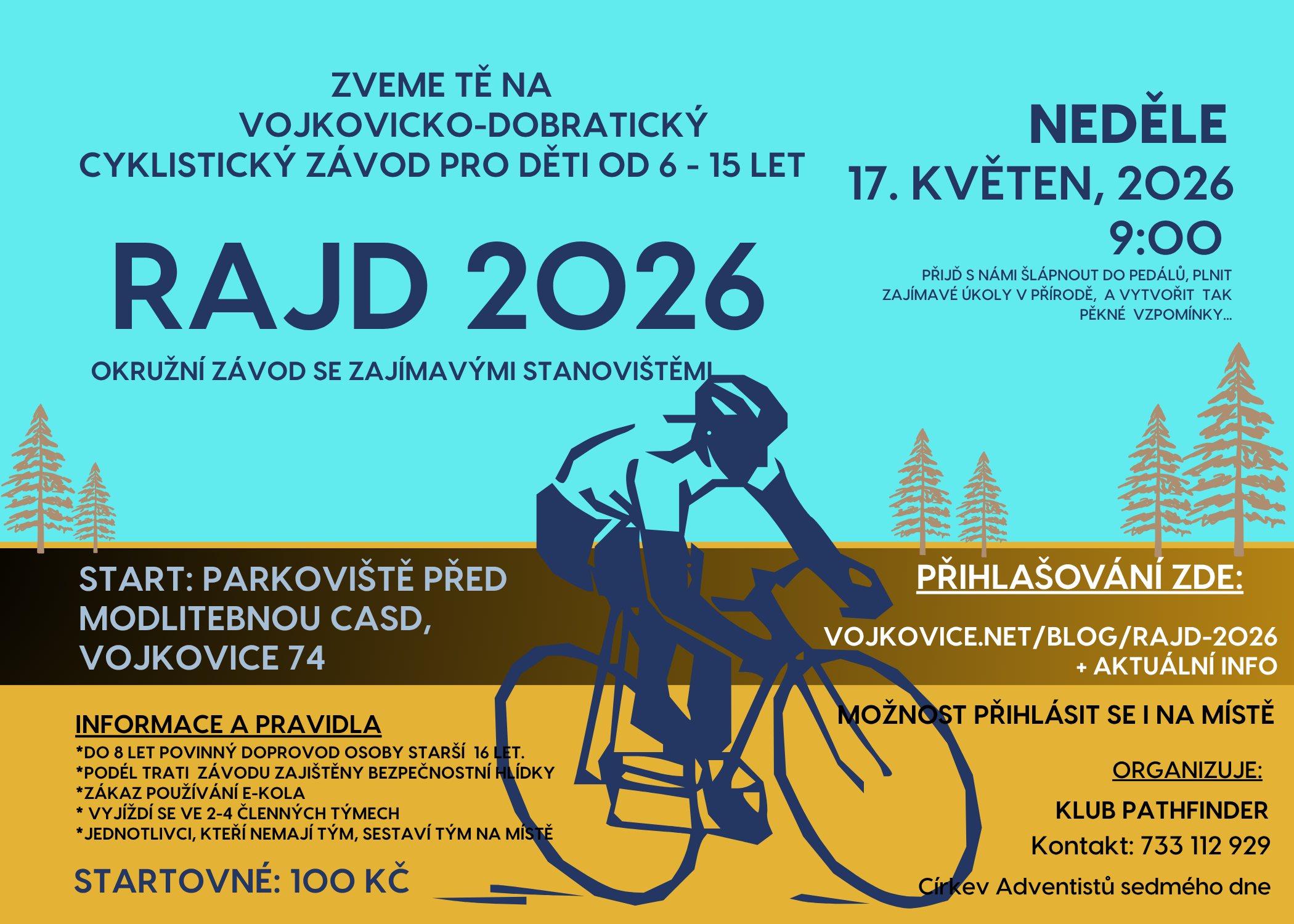 Ahoj, zveme Tě na další ročník cyklistického závodu!!! Závod proběhne v neděli 17. května 2026 od 9:00. Podél trati tě čekají zábavné disciplíny a malé občerstvení. Zúčastnit se může každé dítě, které již zvládá jízdu na kole. Pouze do 8 let věku je nutný doprovod dítěte starší 16 let.